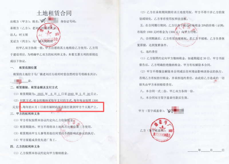村委会到底怎样把土地租出去的呢?村民提供了一份《土地租赁合同》,合同显示,出租方是村民,承租方是老刘庄村委会,见证方是马厂镇政府。租赁期限从2025年6月1日至2040年5月30日。租金为每年每亩1300元,由镇财政所直接打款至被租地农户账户。合同表示租赁土地为建设项目,约定到期后如不续租,负责恢复原貌,达到复耕条件。