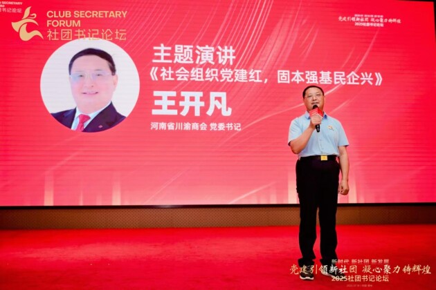 主旨报告环节,河南省川渝商会党委书记王开凡以“社会组织党建红、固本强基民企兴”为主题,分享了社会组织党建工作对民营企业发展的重要作用,报告内容深刻,引发广泛共鸣。